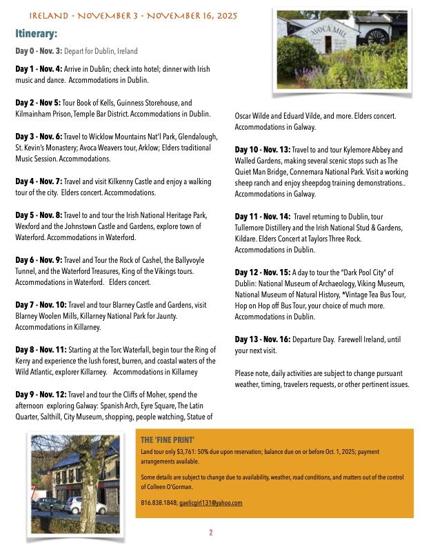 This tour will begin in Dublin, travel north to Belfast, The Giant Causeways, Londonderry, Sligo, Galway, and return to Dublin.